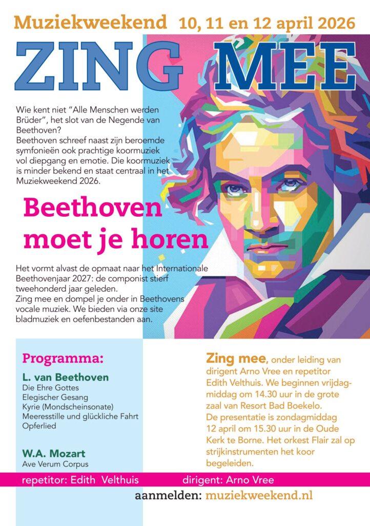 Wat is er nu leuker dan samen te zingen? Of een weekend je laten verwennen in een hotel? Of samen heerlijk te eten? Op 10 t/m 12 april 2026 zingen we muziek van Beethoven. Benieuwd? Kijk onder het kopje Informatie 2026.